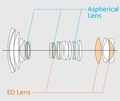 렌즈 구성 | 19 군 25매 (비구면 렌즈 3매 및 ED렌즈 3매 포함) |