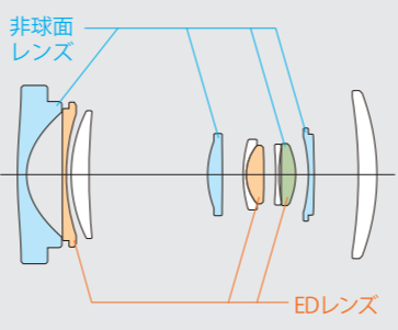 - 9군 10매 렌즈 구성에 비구면 렌즈 4매와 저분산(ED) 렌즈 3매를 탑재했습니다. 광각 렌즈의 특성인 왜곡, 필드 커브, 색수차를 전체 줌 범위에서 억제하면서도 당사 줌 렌즈 중 가장 작고 가벼운 컴팩트한 디자인을 실현했습니다.