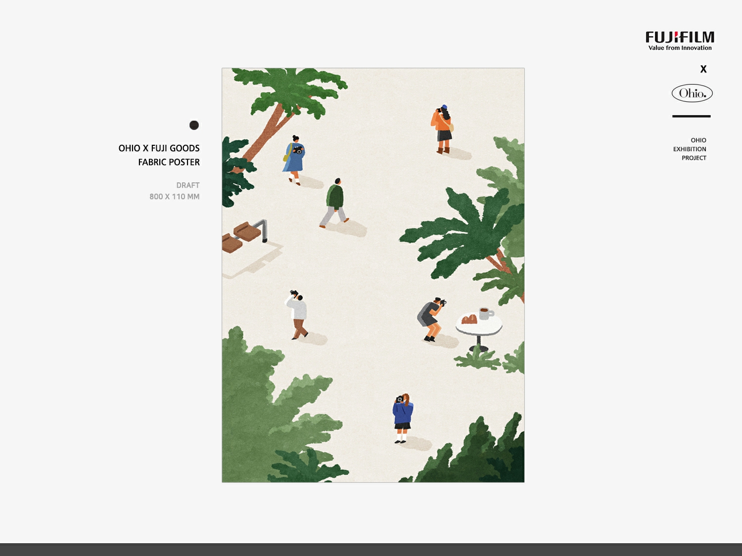후지필름코리아 10주년 전시 <#PHOTOGRAPHY>의 아트상품인 일러스트레이터 오하이오의 패브릭 포스터입니다. 온라인에서 소량으로 판매를 진행합니다. 일러스트레이터 오하이오만의 감성적인 아트웍이 담긴 패브릭 포스터를 활용해 일상 속 따뜻한 무드를 연출할 수 있습니다. 총 20장의 에디션으로 제작되었으며, 상품별로 에디션 넘버가 적힌 카드를 증정해드립니다.